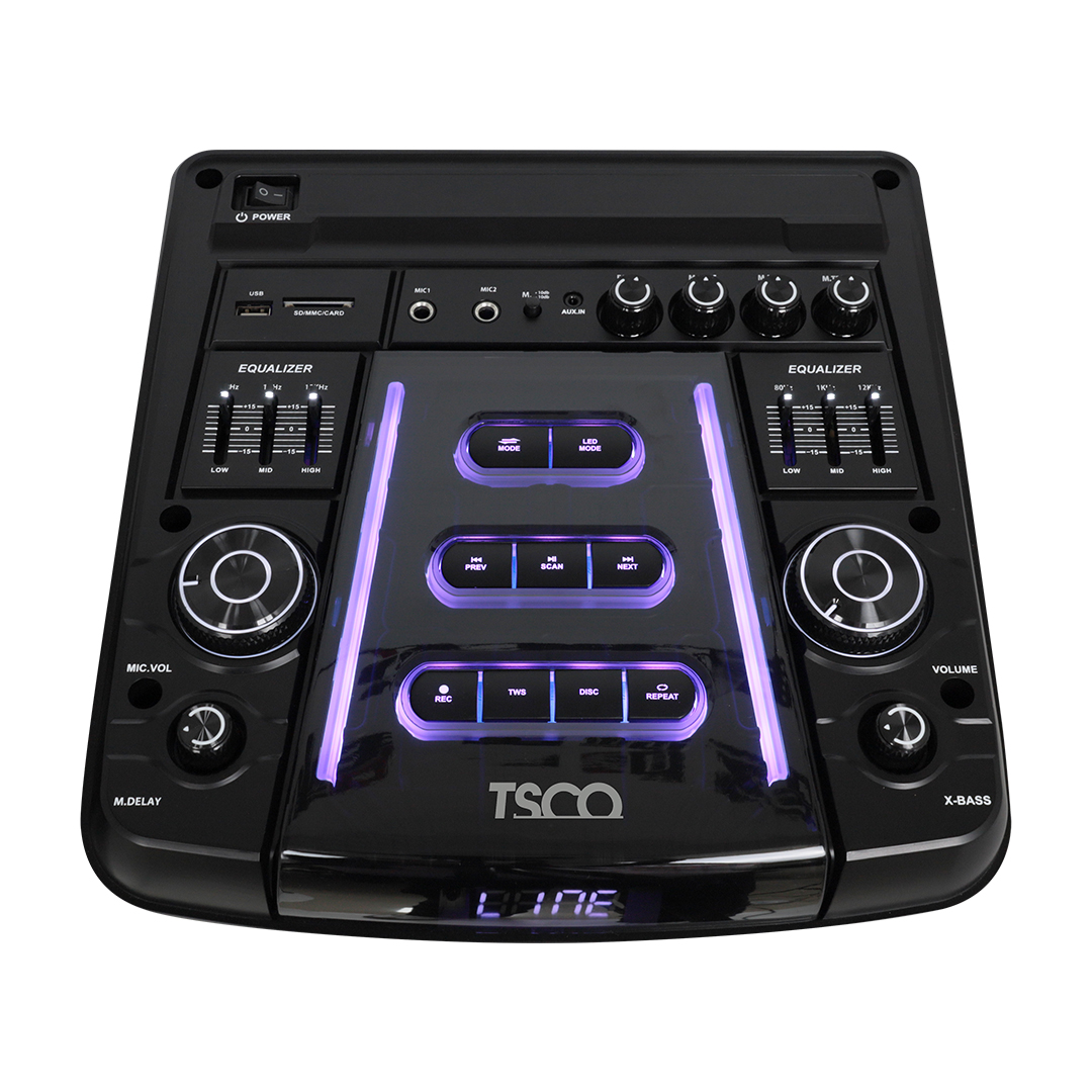 در بالای یکی از یونیتها، پنل کنترل با امکانات کامل قرار دارد: Play / Pause ، Next / Previous ، Mode ، LED On/Off ، Recording ، X-BASS ، EQ 6 باند ، تنظیمات کامل میکروفون ، BT Disconnect و وجود نمایشگر دیجیتال نیز روند استفاده را سادهتر و حرفهایتر میکند.