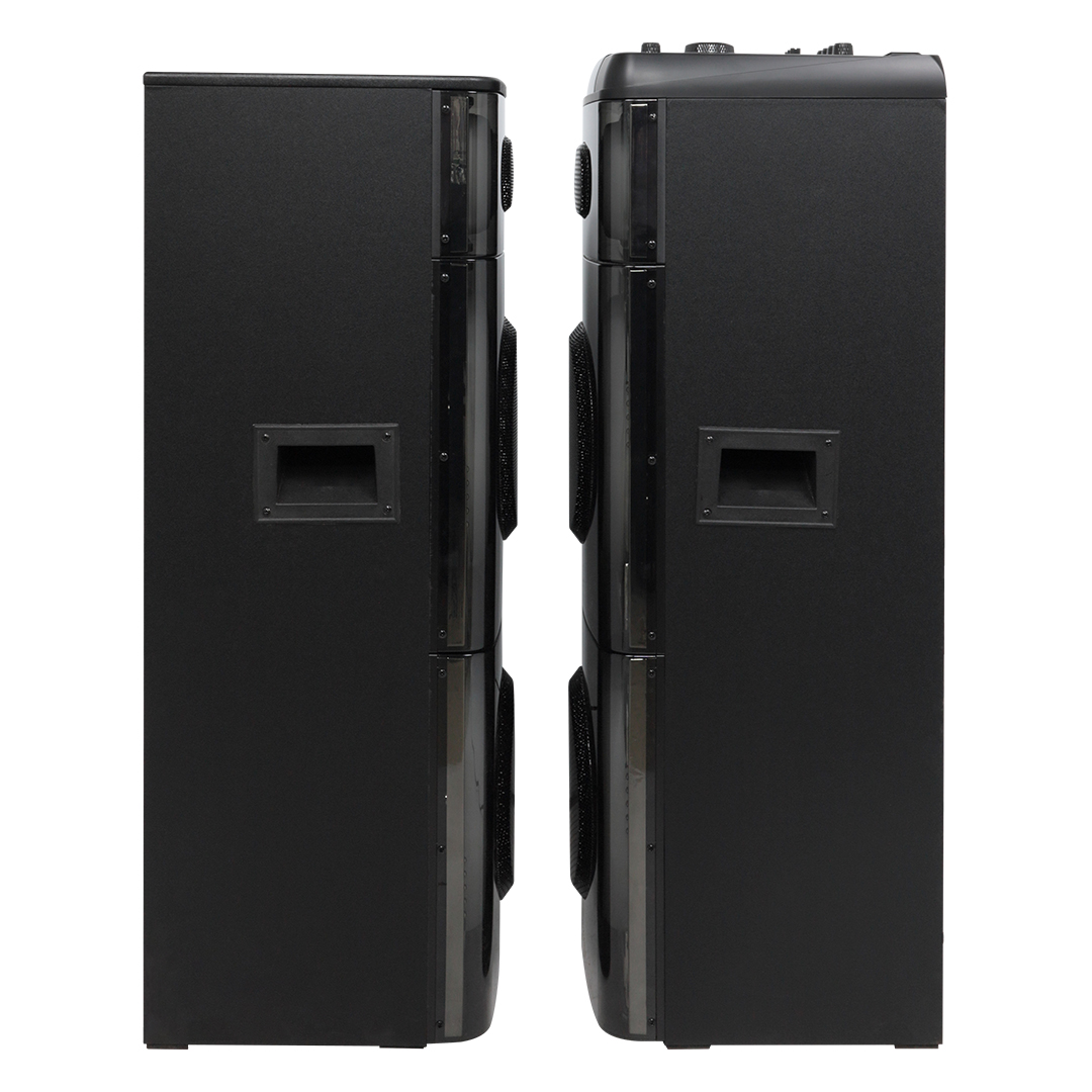 وزن ۴۰ کیلوگرمی اسپیکر نشاندهنده ساختار داخلی قدرتمند و بدنه محکم آن است. رنگ مشکی مات و قاب نقرهای اطراف درایورها ترکیب جذابی ساختهاند که هم مدرن است و هم برای محیطهای مختلف مناسب. این مدل طوری طراحی شده که هم در خانه جلوه زیبایی داشته باشد و هم برای استفاده در سالنها، مراسم، فضاهای نیمهباز و اجراهای زنده مناسب باشد.