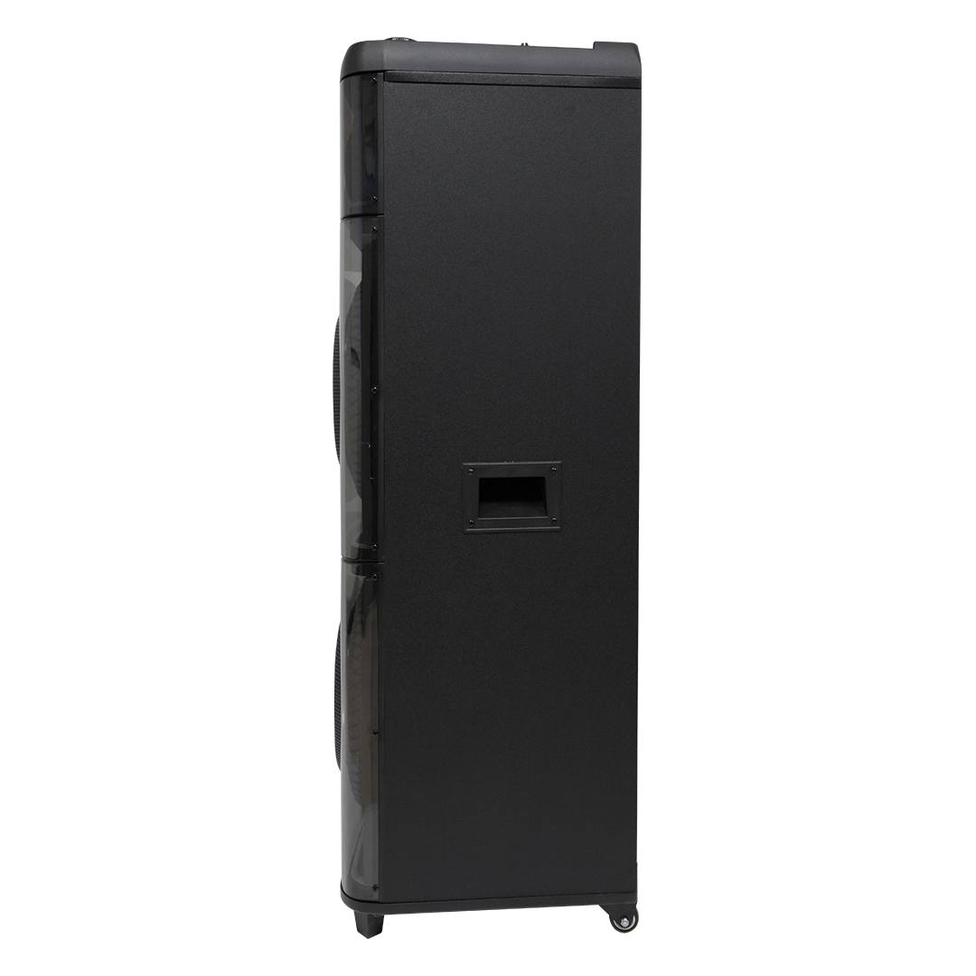 چیزی که در نگاه اول در عکس جلب توجه میکند، دو ووفر عظیم ۱۲ اینچی است. این دو ووفر نه تنها روی قدرت باس تاثیر میگذارند، بلکه ظاهر اسپیکر را بسیار حرفهای و چشمگیر کردهاند. ووفرهای بزرگ باعث میشوند اسپیکر بهجای اینکه یک دستگاه معمولی باشد، شبیه یک ستون صوتی حرفهای دیده شود و این حس قدرت، حتی از دور هم قابل تشخیص است. طراحی تیوتر ۳ اینچی در بخش بالایی نیز یک ترکیب متعادل از ظاهر و عملکرد ایجاد کرده است.