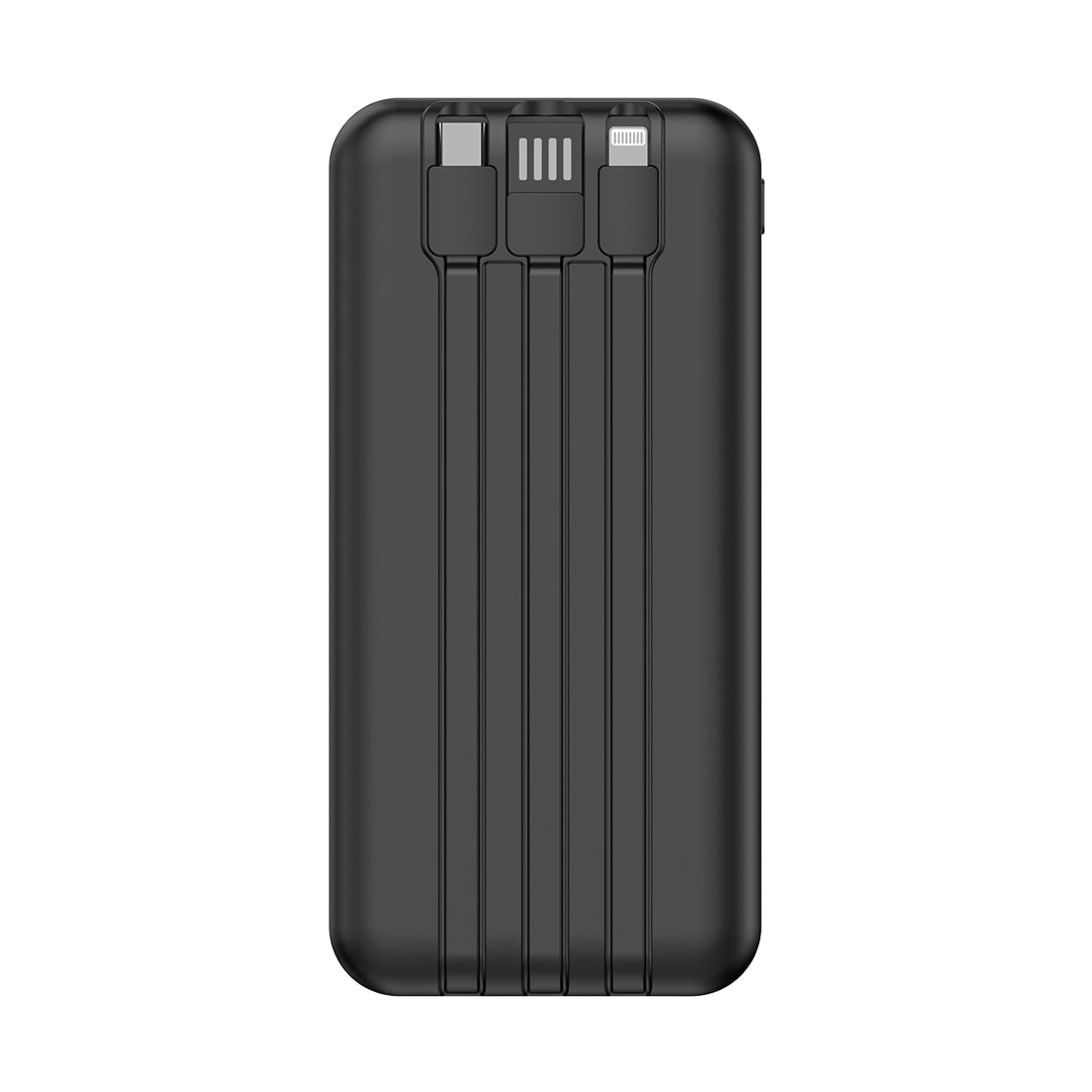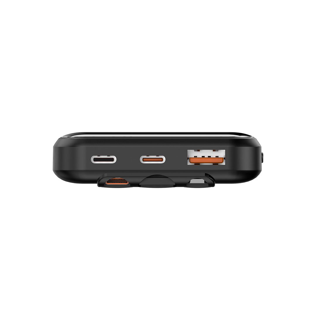یکی از شاخصترین ویژگیهای این پاوربانک، وجود سه کابل متصل و غیرقابل جداشدن روی بدنه است. این کابلها شامل Lightning، Type-C و USB-A هستند که بهصورت تاشو در پشت دستگاه جای گرفتهاند. این طراحی هوشمندانه دو مزیت اصلی دارد: دیگر نیازی به حمل کابلهای متعدد در کیف یا جیب ندارید. همیشه مطمئن هستید برای شارژ هر دستگاهی، کابل مناسب در دسترس دارید. این ویژگی بهویژه برای دانشجویان، کارمندان و مسافرانی که همیشه در حرکت هستند، مزیتی کلیدی محسوب میشود.