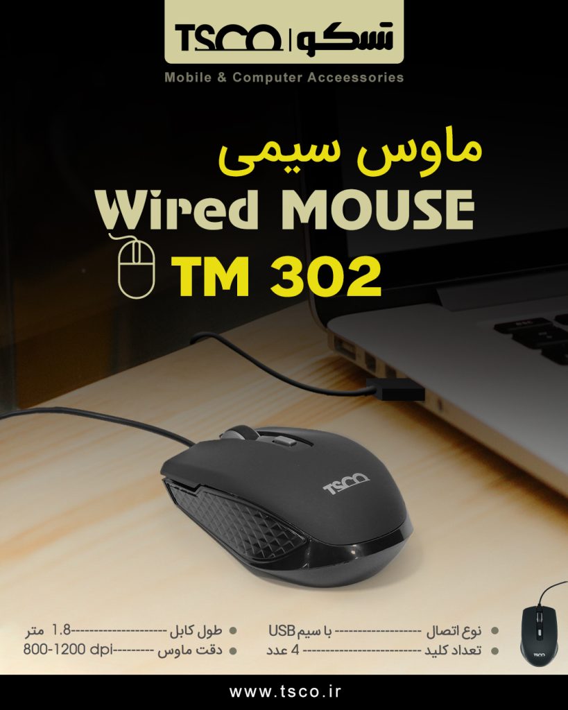 ماوس تسکو مدل TM 302 توسط سیم به کامپیوتر متصل می شود. ابعاد آن کوچک بوده و حجم کم و وزن فوق العاده سبکی دارد.